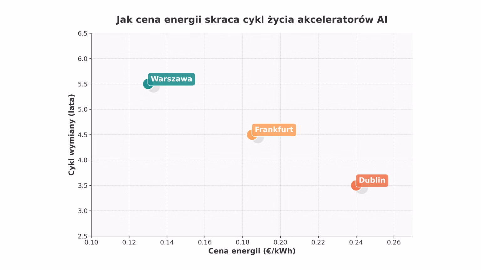 Niniejszy artykuł porównuje ceny energii w trzech kluczowych europejskich hubach danych – Frankfurcie, Dublinie i Warszawie – z efektywnością energetyczną kolejnych generacji akceleratorów AI. Na tej podstawie analizujemy, jak koszty operacyjne i postęp technologiczny skracają lub wydłużają cykl życia sprzętu AI.