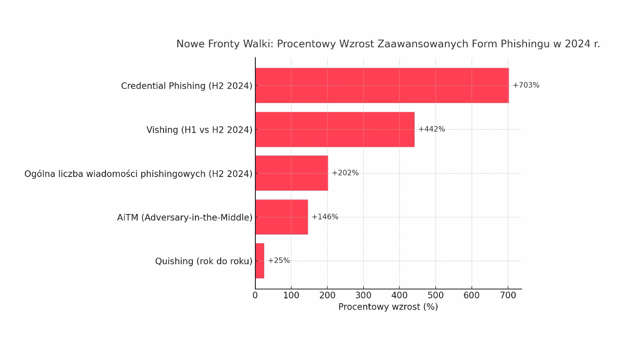 Skala transformacji znajduje odzwierciedlenie w twardych danych. Raporty wskazują na wzrost liczby e-maili phishingowych o 1,265%, bezpośrednio wiążąc go z upowszechnieniem się technologii GenAI. Całkowity wolumen phishingu wzrósł o 4,151% od debiutu ChatGPT.